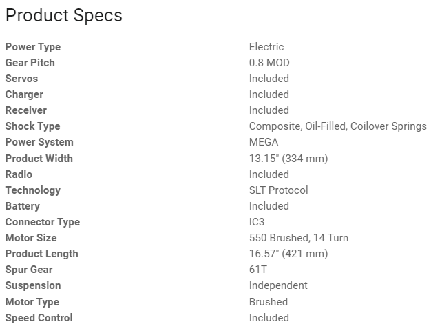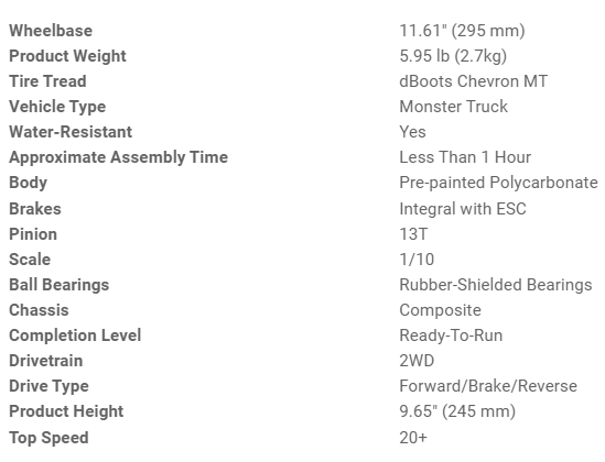 Go ahead and send it over punishing tracks. Proven ARRMA engineering gives the composite chassis bash-it-all durability. The independent suspension, oil-filled shocks, and adjustable ride height combine to provide a smooth ride over rough terrain. For unstoppable traction, the ARRMA GORGON MT monster truck's 2WD transmission moves power from the MEGA 550 motor to massive rubber dBoots® Chevron tires on tough nylon wheels. Its metal gears are tough enough to take on brushless power, too.