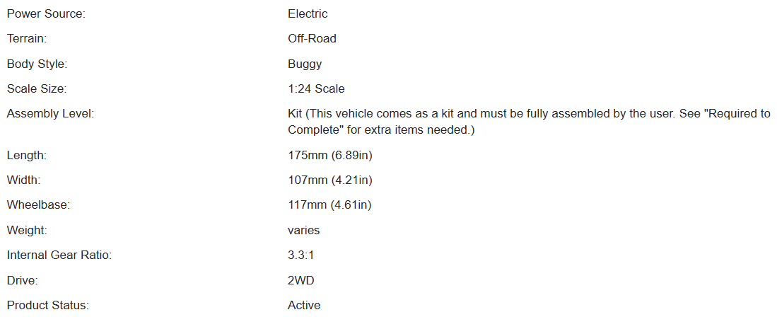 Authentic precision hobby-grade 1:24 scale replica of the original RC10 Classic buggy