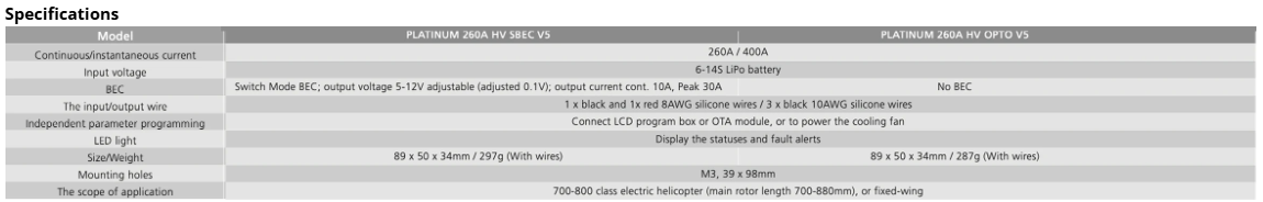 Bottomline:The Platinum V5 series features a new heat sink design that cools with craft airflow, providing both external and internal ESC cooling.Built-in 12V Switch BEC with adjustable voltage...