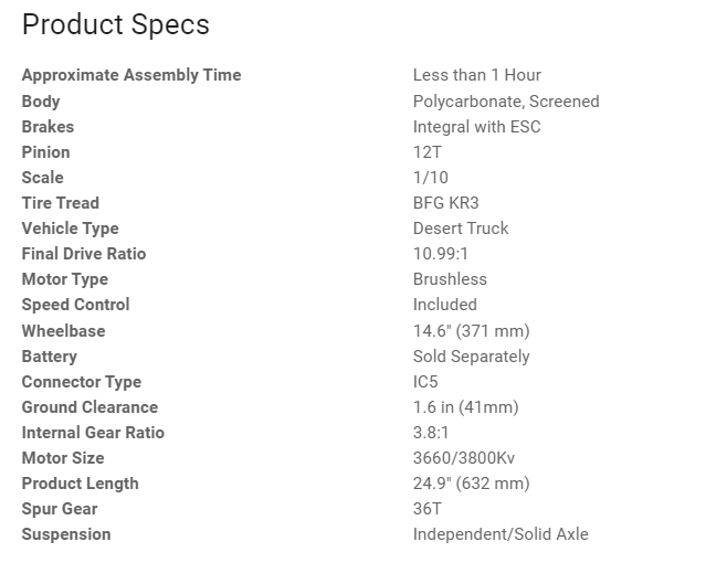 The Baja Rey 2.0 comes equipped with a Spektrum 3800Kv brushless motor and a waterproof 130A ESC. This potent combination can handle 2S or 3S LiPo batteries (sold separately) and give you the power to hurtle across the desert at speeds of up to 50+ mph.